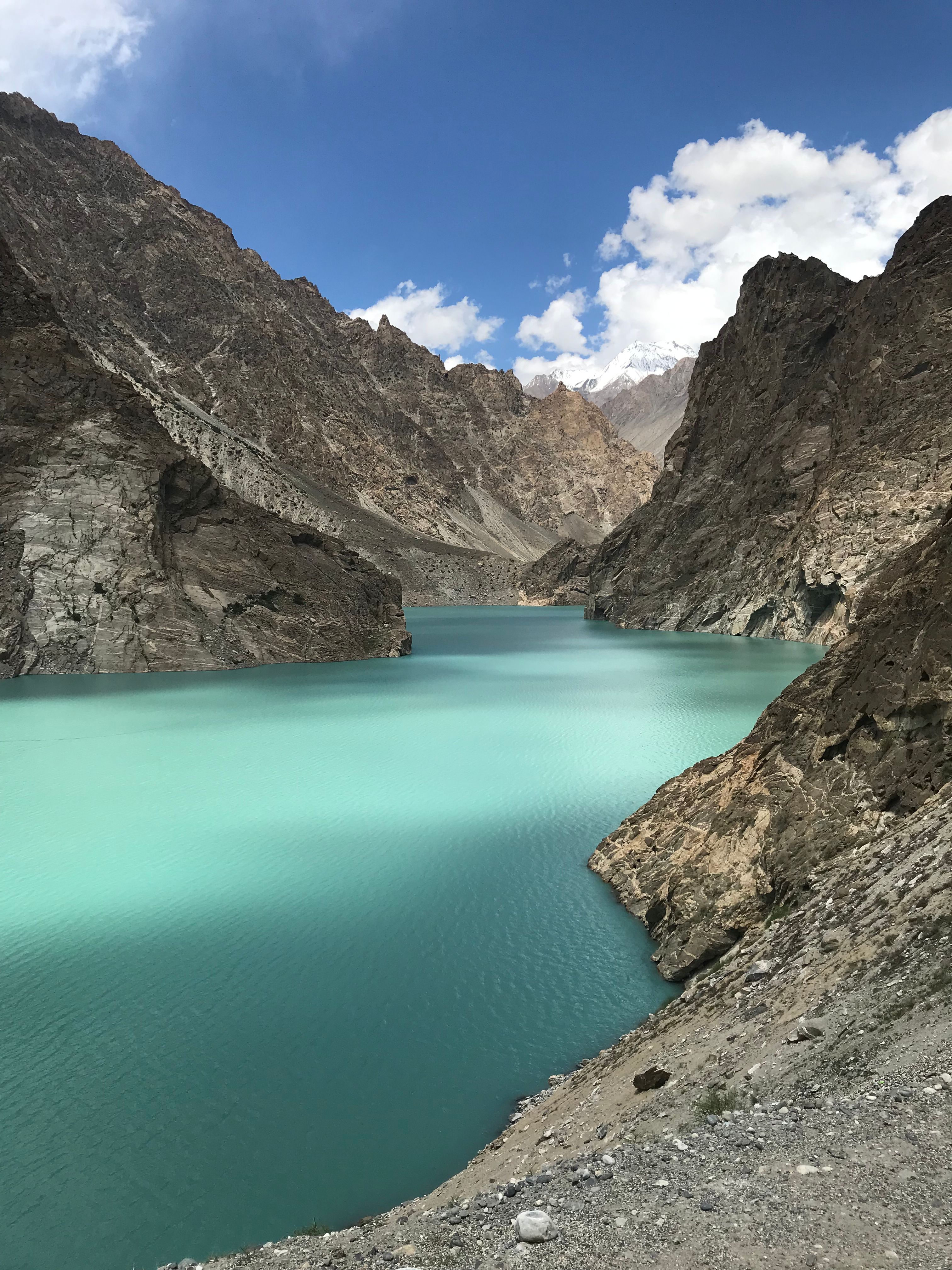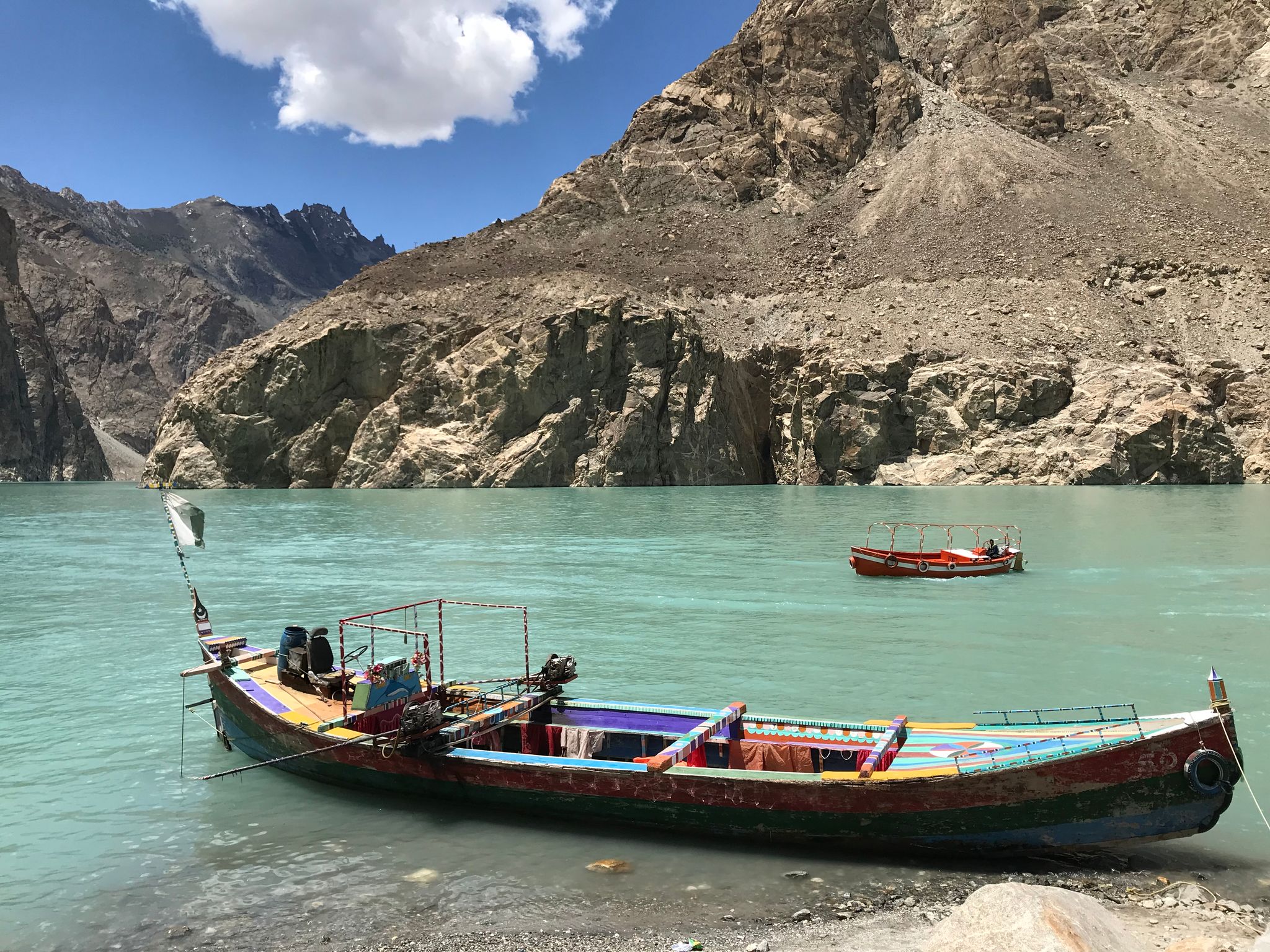 Not long into our continued journey down the Karakoram Highway, view of the stunning Attabad Lake and its uniquely bright turquoise water caught us all by surprise. How is such pristine color even possible?? The lake was formed in 2010 due to a massive landslide creating a dam, blocking the Hunza River flow. Sadly, many villages were flooded and more than 25,000 people were displaced. These days, the lake is heavily visited by tourists for fishing, boating, jet skiing, and general recreation. We took a short and scenic boat ride on the lake in colorful wooden boats, with abrasively loud motors attached. The surrounding views were absolutely breathtaking, like nothing I’ve ever seen before.