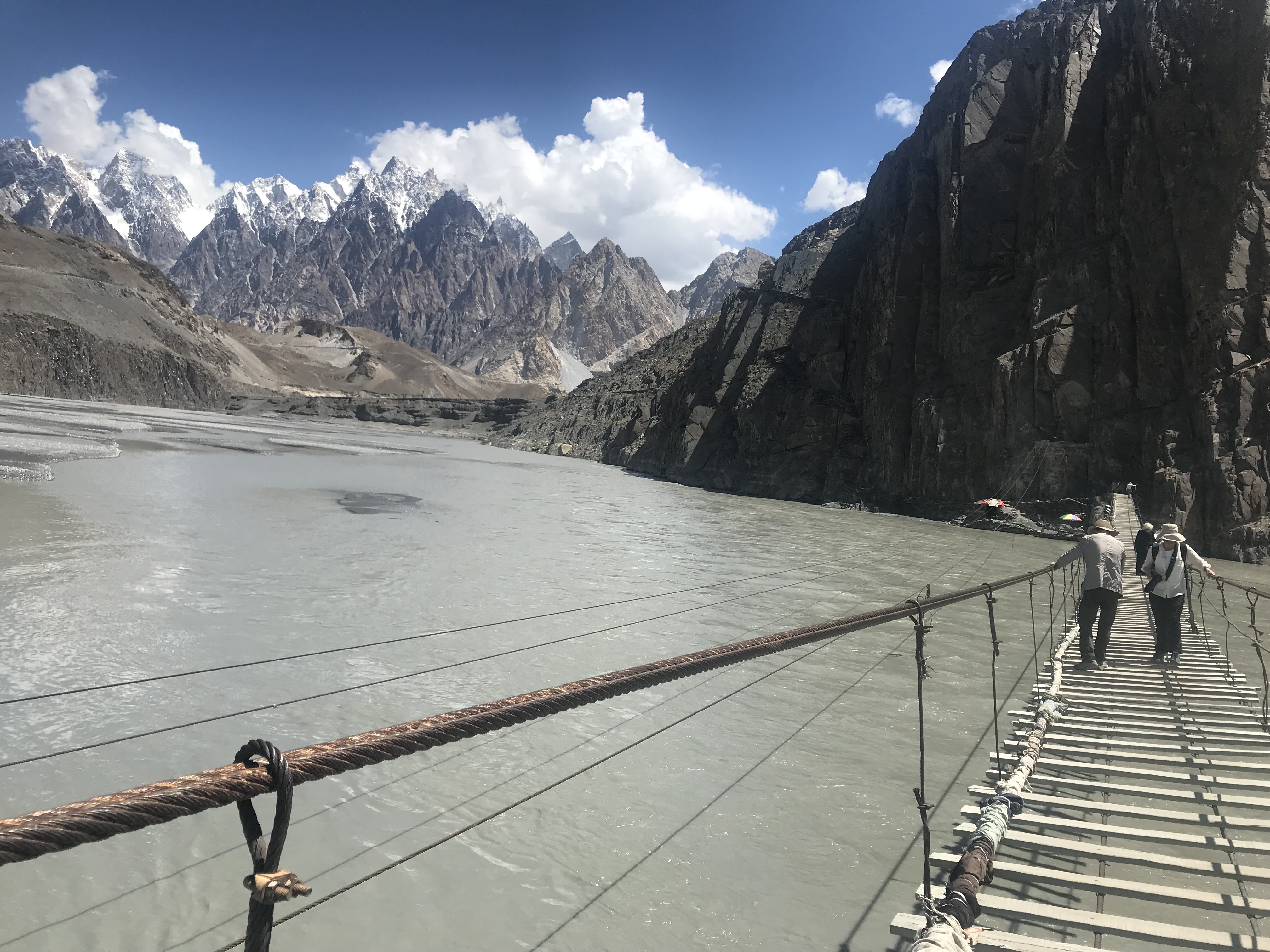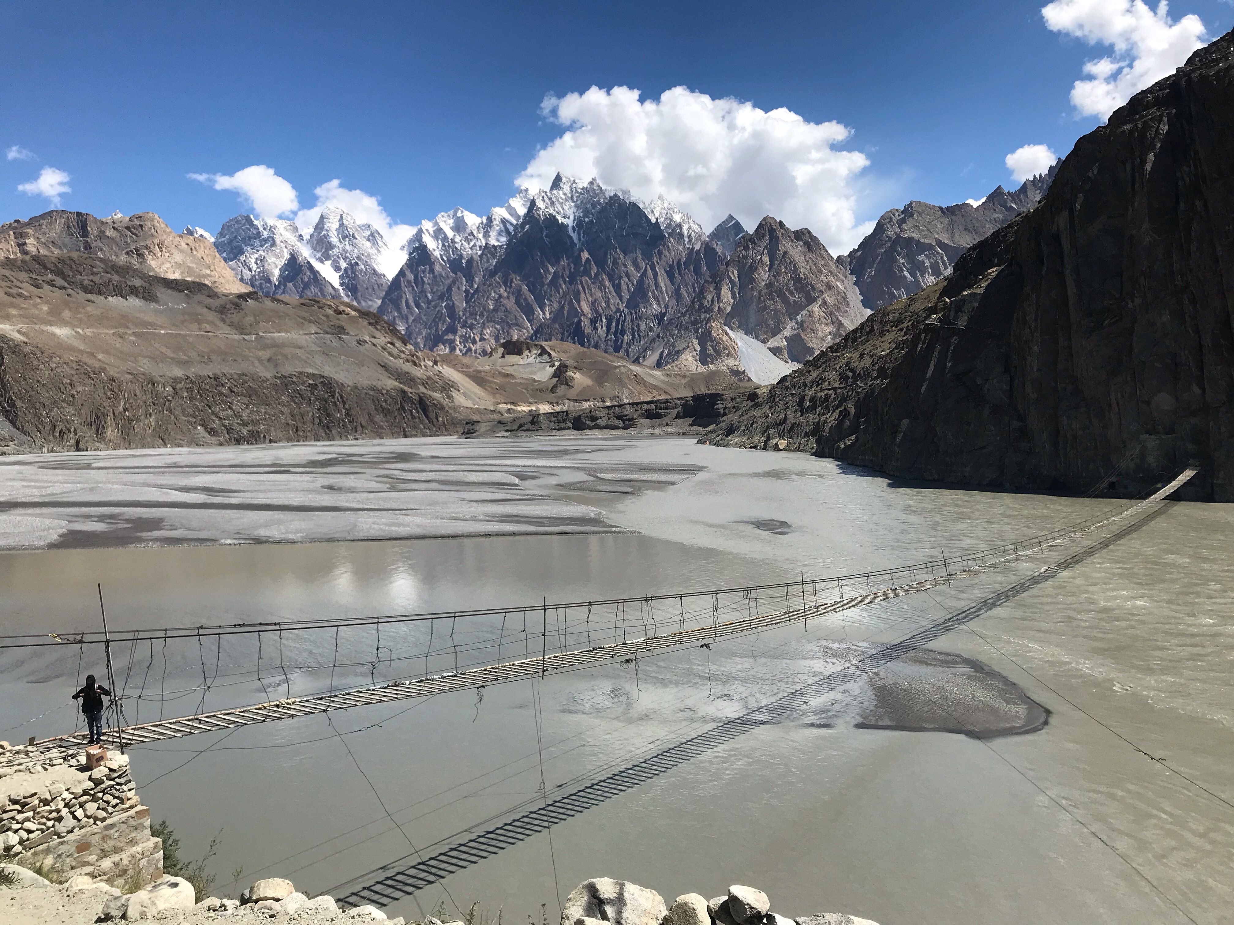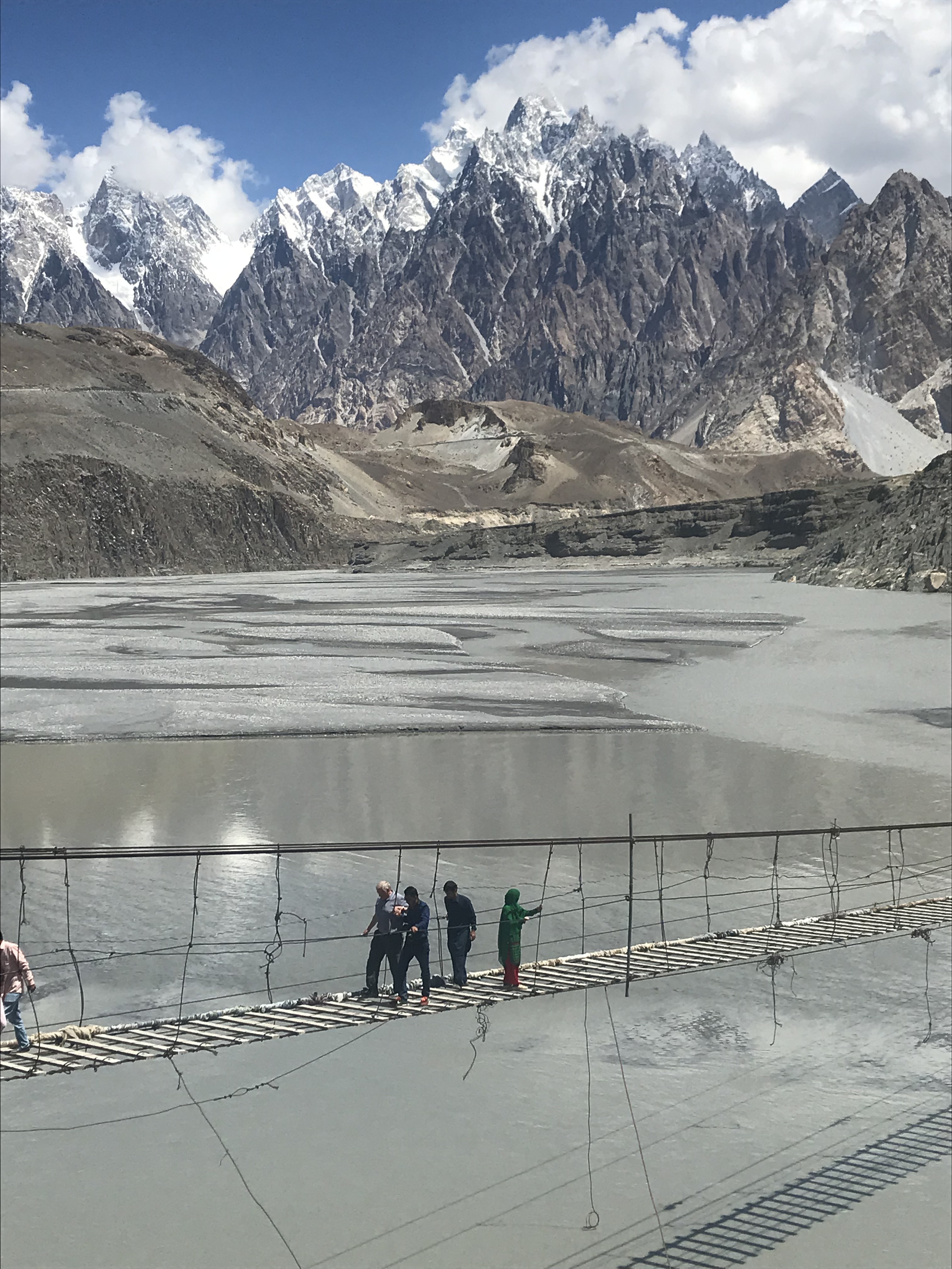 Our next epic stop – Hussaini Suspension Bridge. Hanging high above the Hunza River, the bridge and it’s far-reaching wood planks are almost as sensational as the surrounding landscape. As the story goes, in 1960, the President of Pakistan, Ayub Khan, visited Zarabad to hunt, and directed local authorities to construct a suspension bridge which was finally completed in 1967-68. A few of us opted to cross the bridge, and my Indiana Jones alter-ego was beyond thrilled. It was in our best interest to hold tight to the siding as our legs stretched from plank to plank, watching the river flow far below (some sections looking much deeper than others). I was in complete awe looking in each direction. The following pictures hopefully give a glimpse as to why, but they don’t do justice expressing the thrilling beauty.