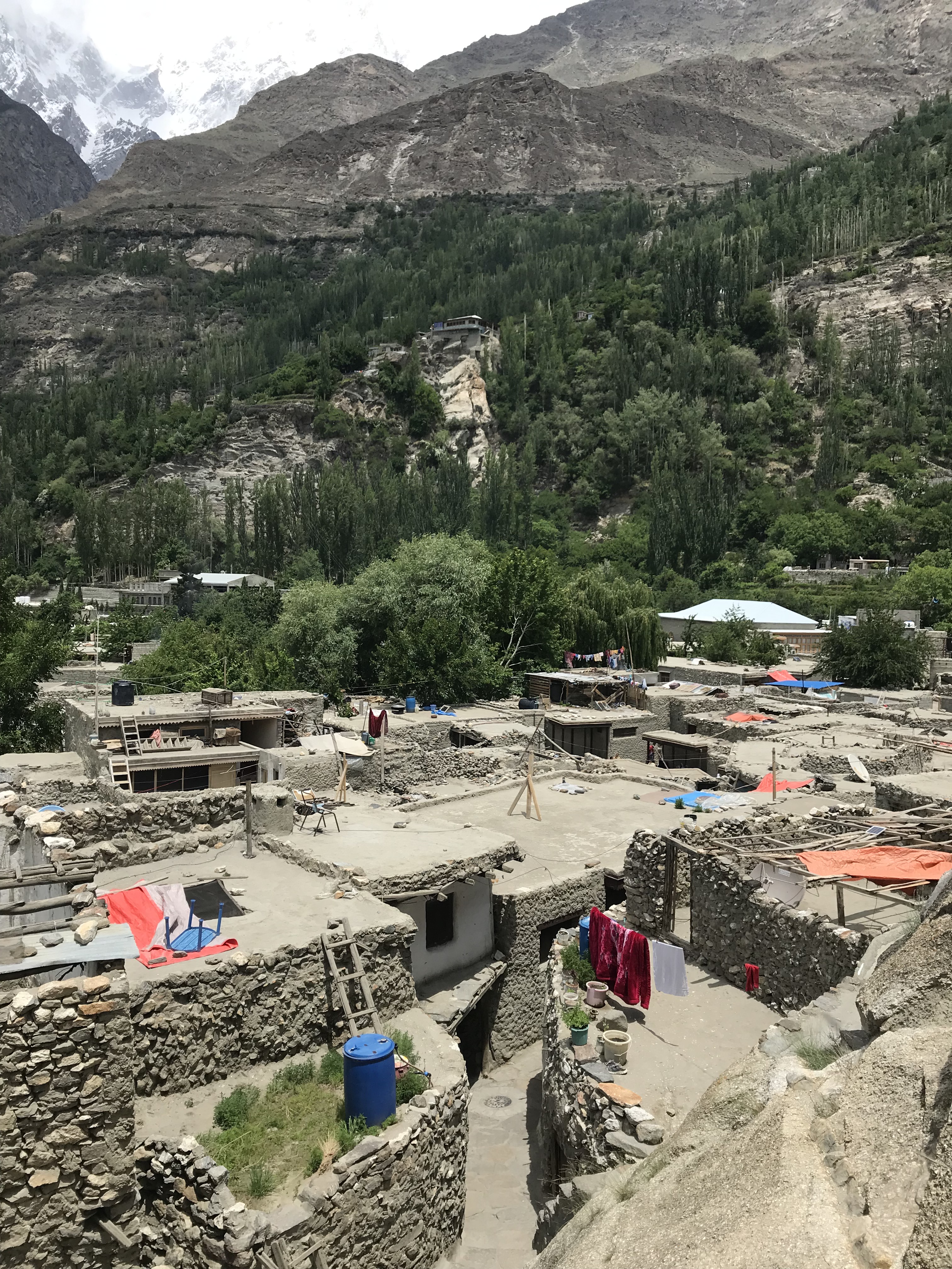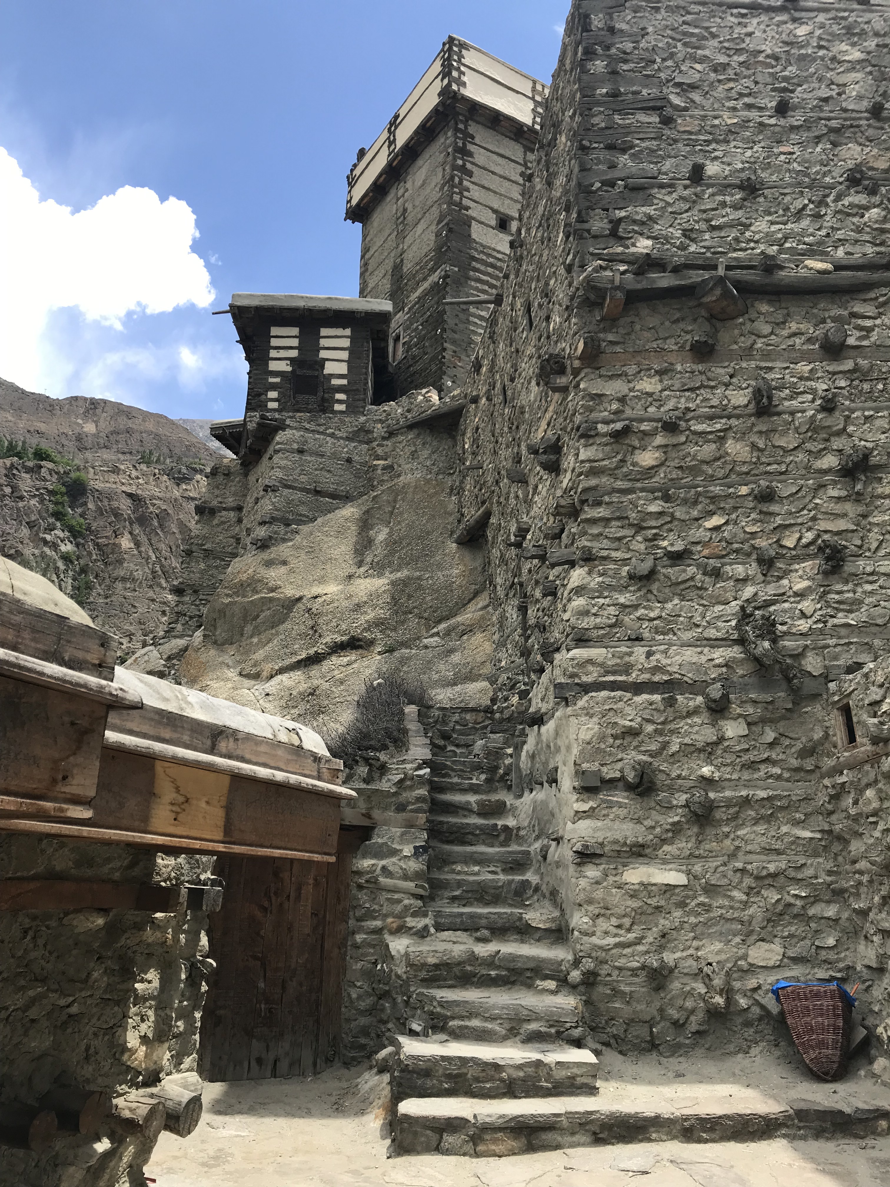The fort entrance is up a steep stone slope with faintly carved steps. Once in the fort, the only direction to go is up more steep wooden stairs, but this time there are walls to hold on to. Restorations of the fort have allowed tourists to explore various rooms by crawling through tiny doorways, said to have been engineered to make it difficult for invaders to quickly run through. Looking down from the sheer cliff drop-off was the rushing Hunza River. In the other direction were dense village homes, made from mud and clay, lining the valley floor. It was oddly hypnotizing simply watching locals go about their day, feeding their livestock or playing rooftop games with friends and family.
