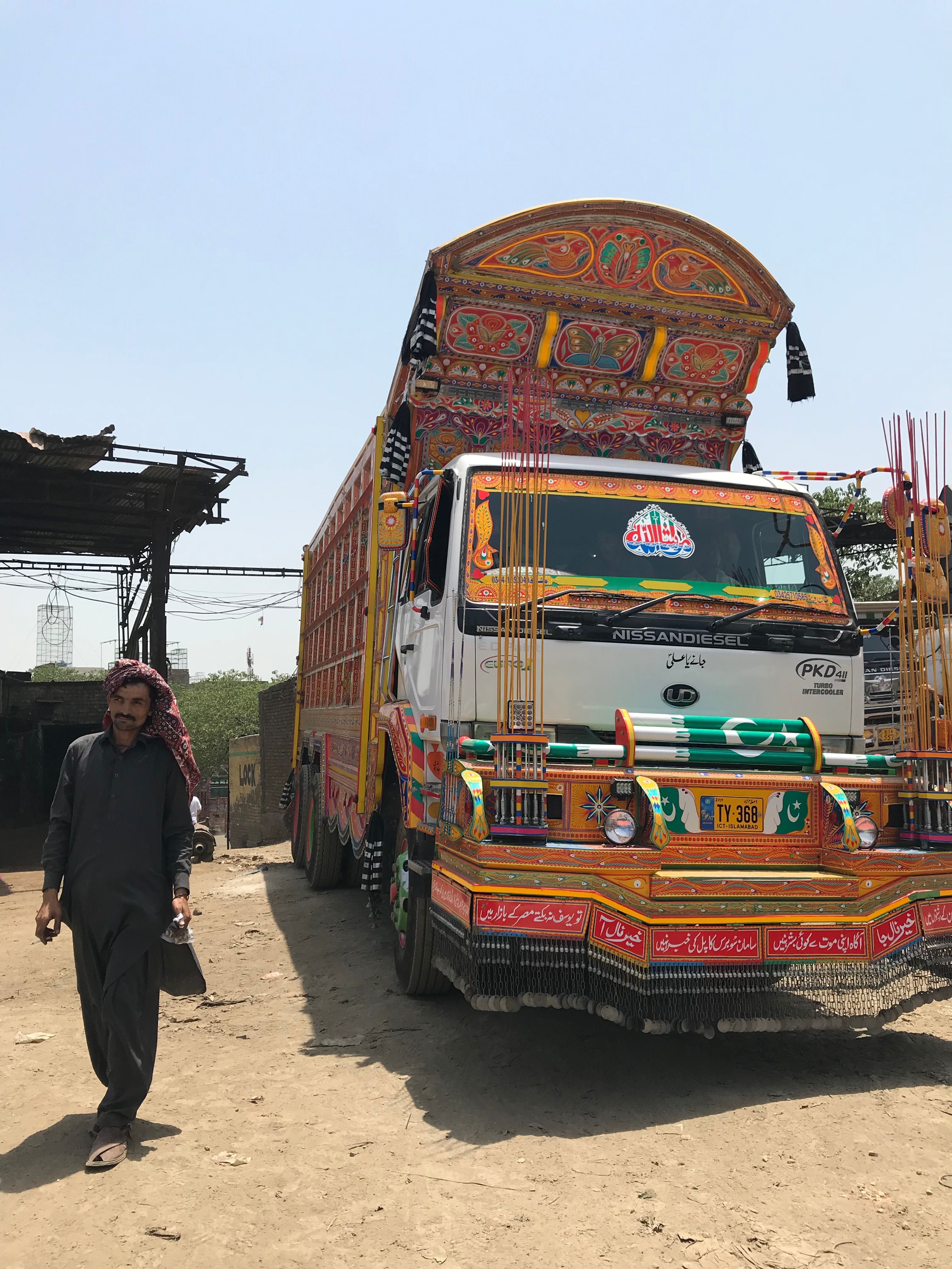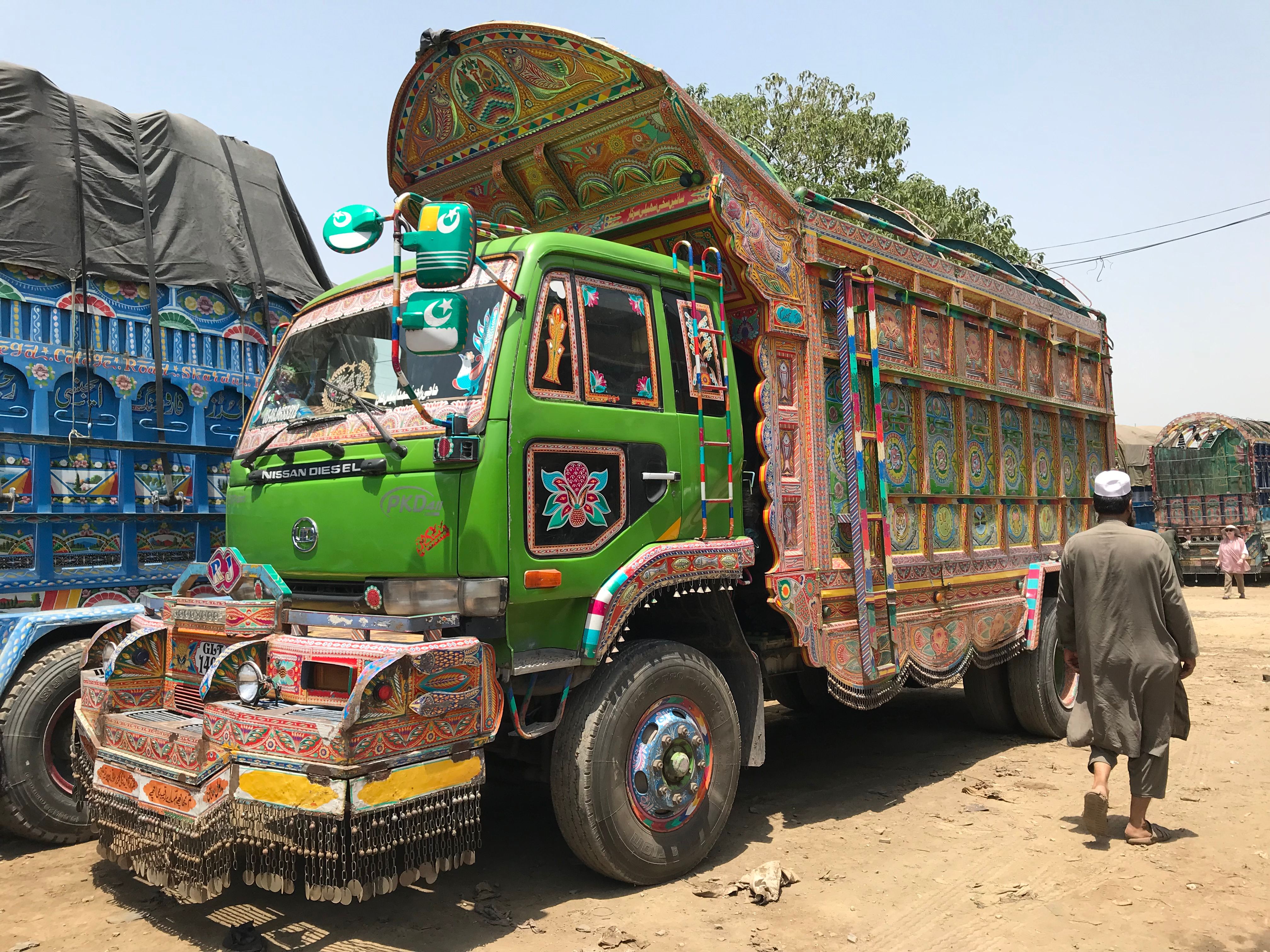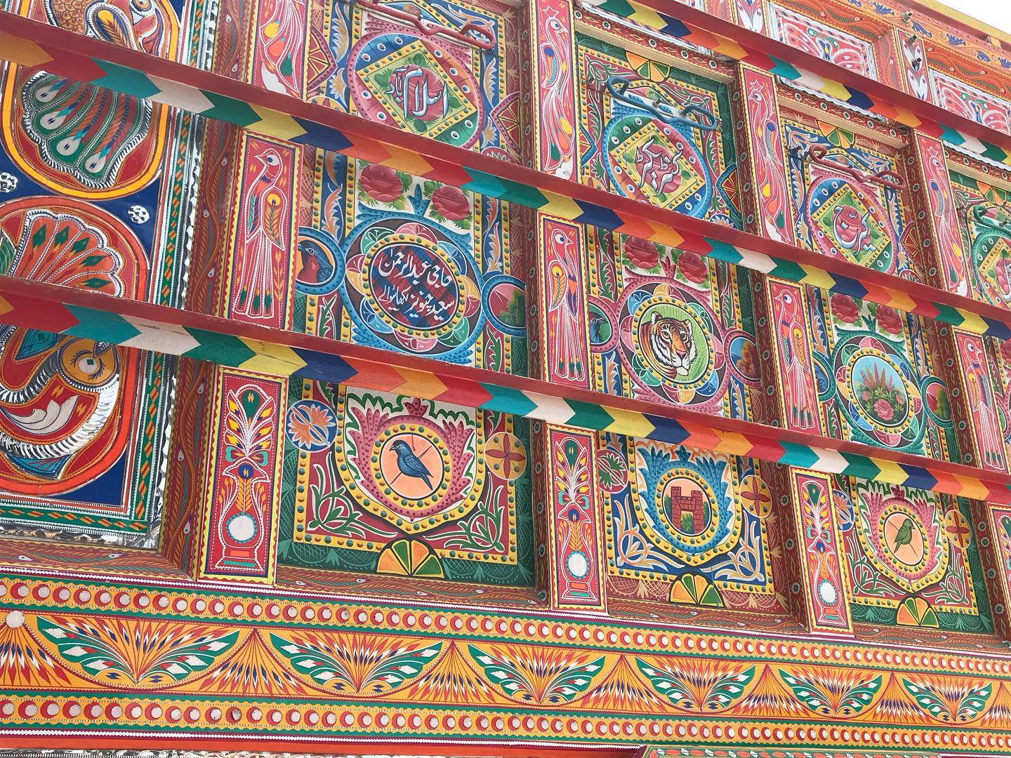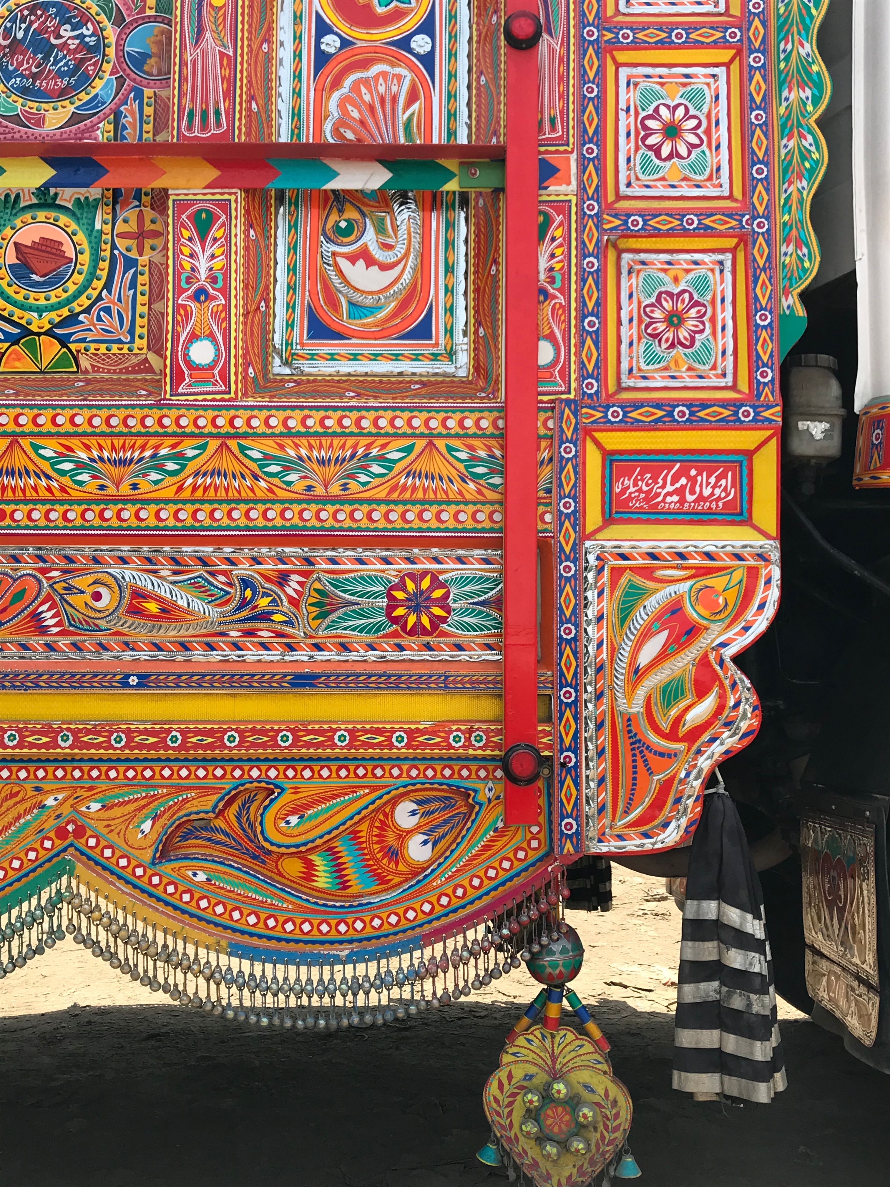 Trucks and buses that travel the span of Pakistan are highly customized and decorated by their owners. External truck decoration can cost thousands of dollars, but the significance is beyond measure to drivers that spend weeks or months away from home. Designs are often meaningful reminders of home, as well as good luck charms for maneuvering winding, exposed, and often dirt roads. The art is a mode of expression for the truck drivers.