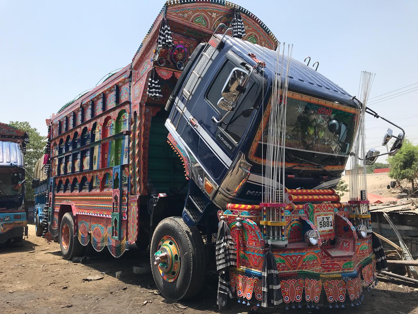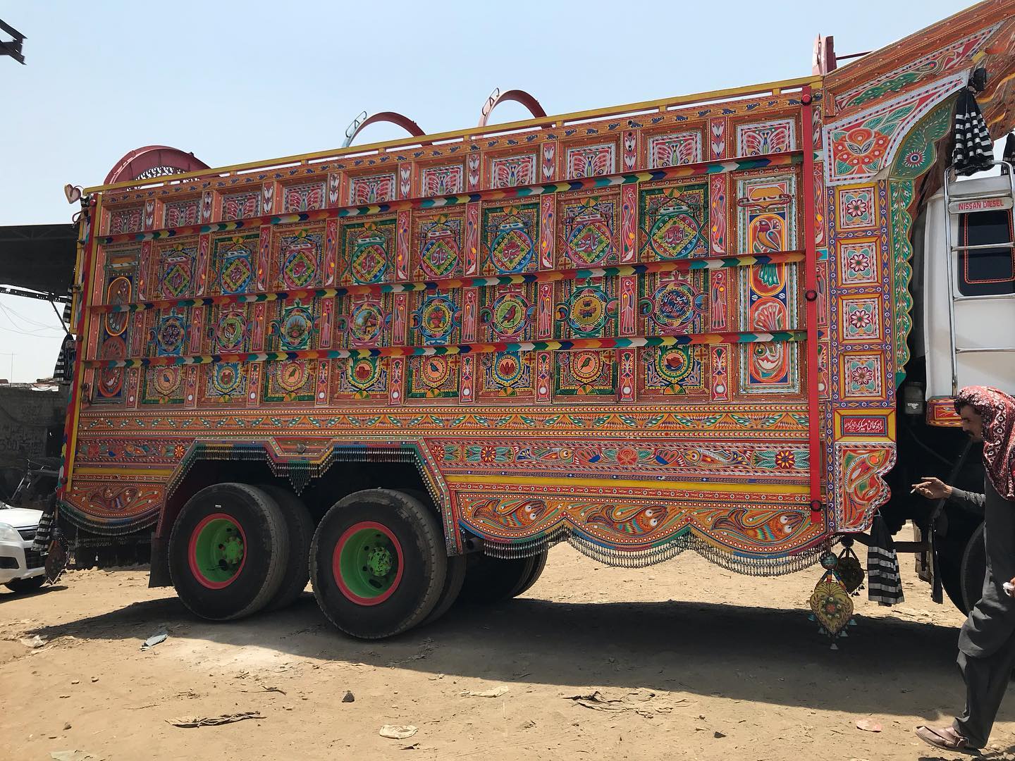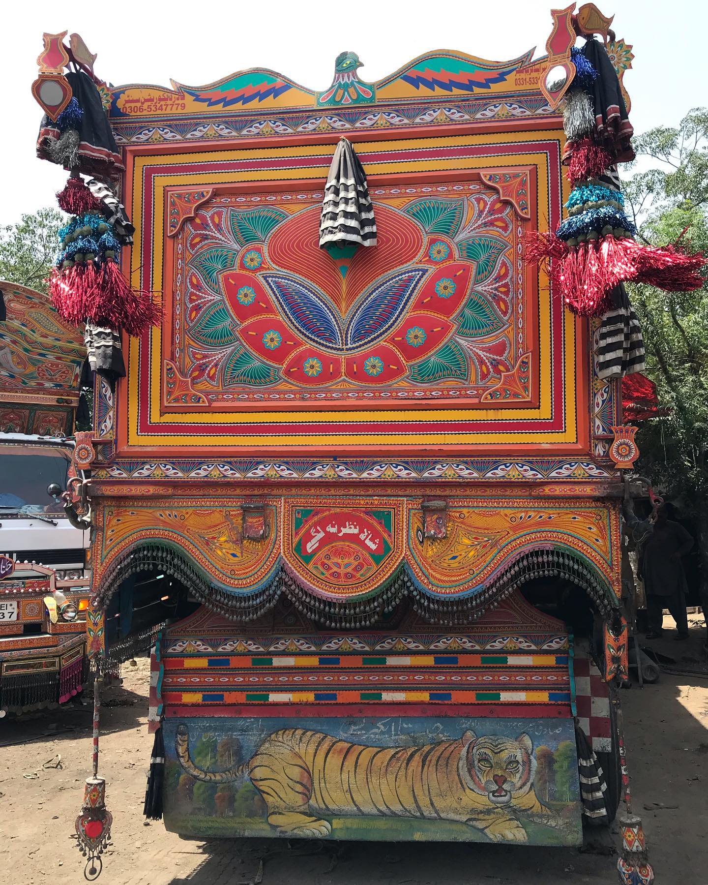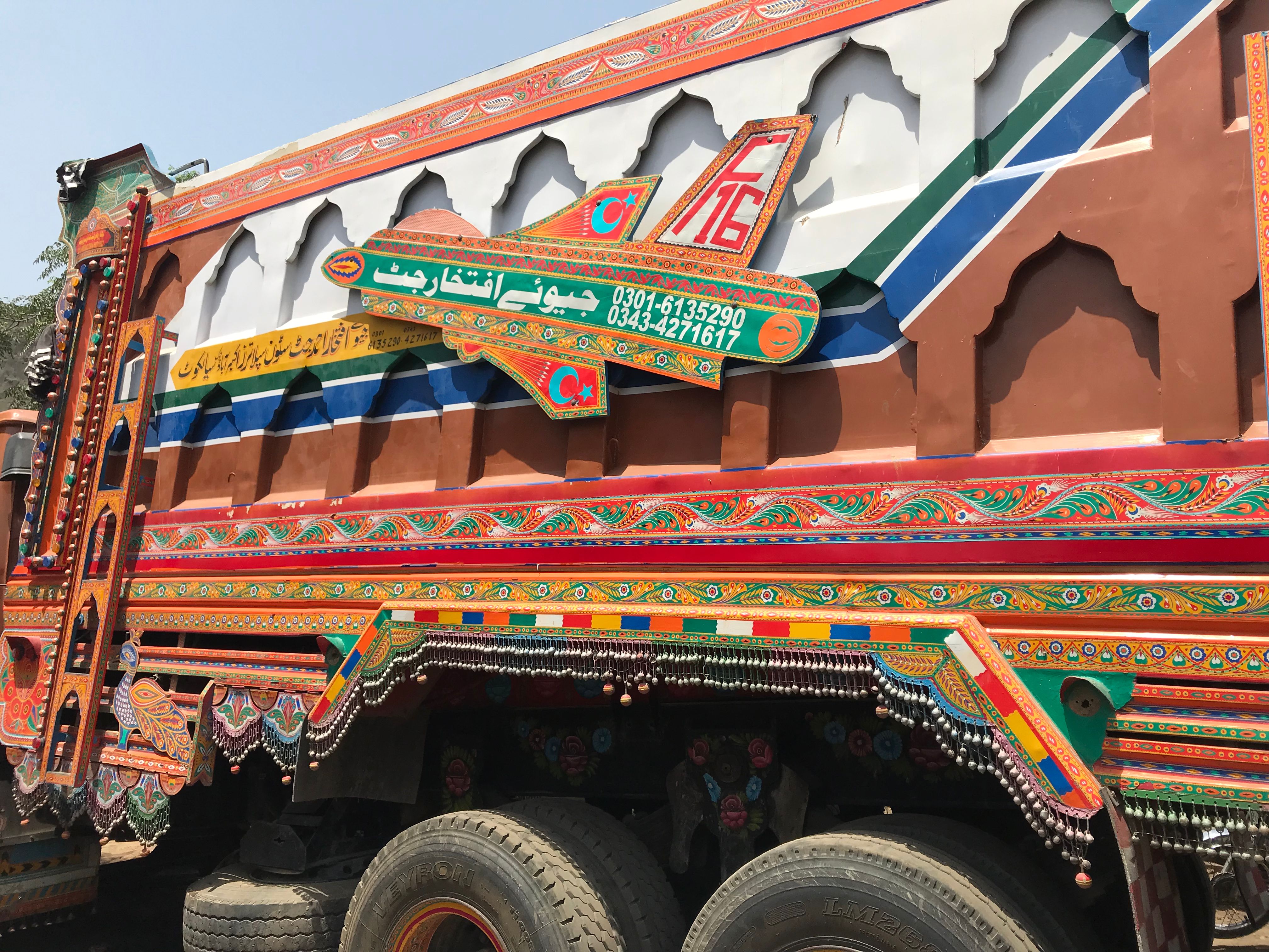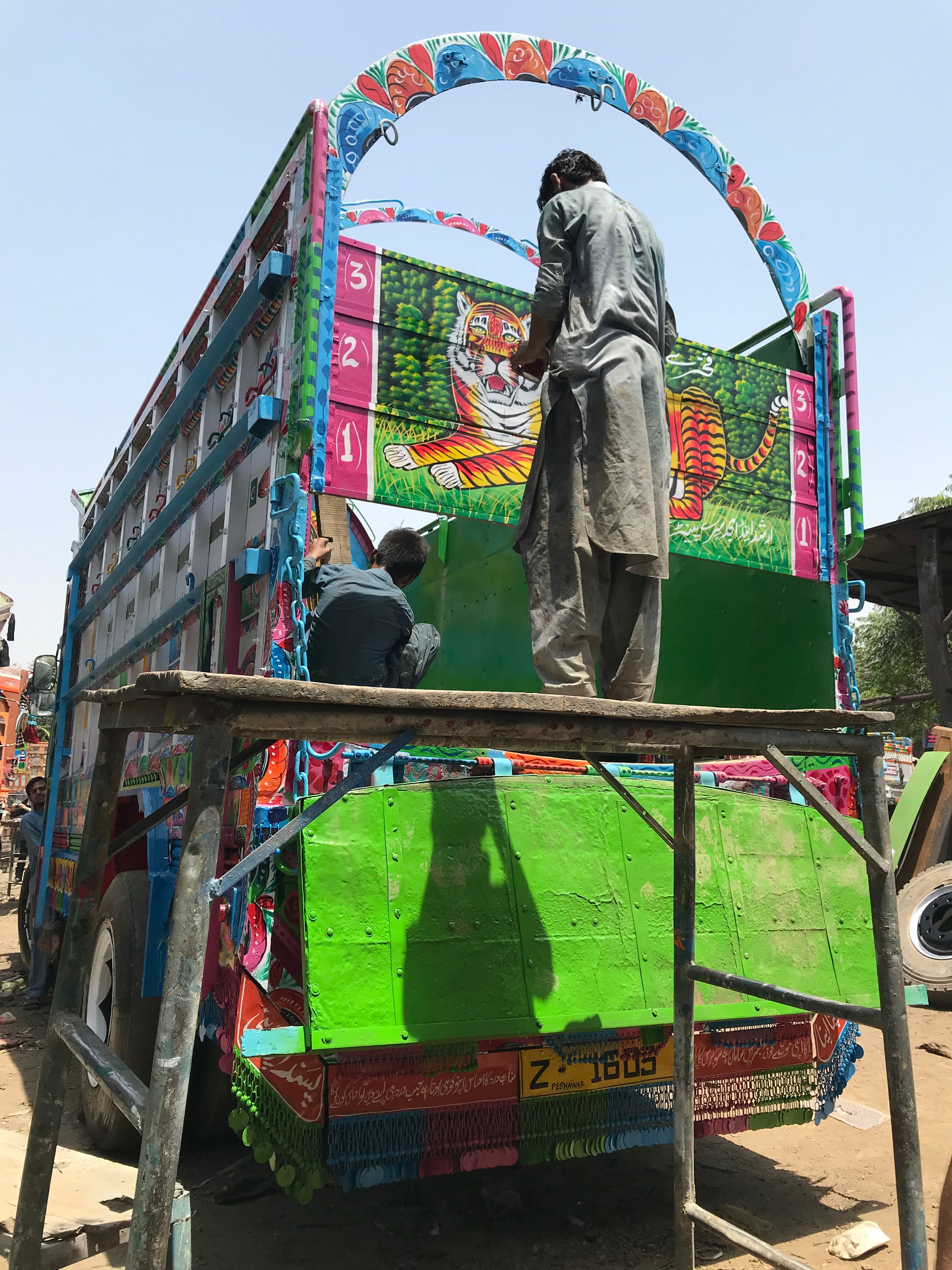 Trucks and buses that travel the span of Pakistan are highly customized and decorated by their owners. External truck decoration can cost thousands of dollars, but the significance is beyond measure to drivers that spend weeks or months away from home. Designs are often meaningful reminders of home, as well as good luck charms for maneuvering winding, exposed, and often dirt roads. The art is a mode of expression for the truck drivers.